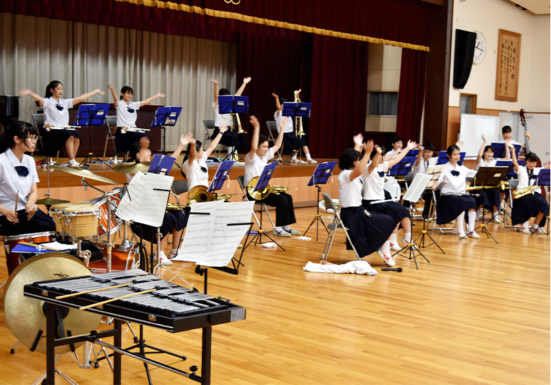 ③活動内容:年間活動としては,春は新入生歓迎演奏会と体育祭での開会式や閉会式での演奏,夏は吹奏楽コンクール,秋は校内文化祭や高松市教育文化祭音楽会,冬はアンサンブルコンテストに参加しています。また,常時活動内容としては,平日は基礎練習を中心とした個人練習を行い,休日は基礎合奏と曲合奏を行っています。